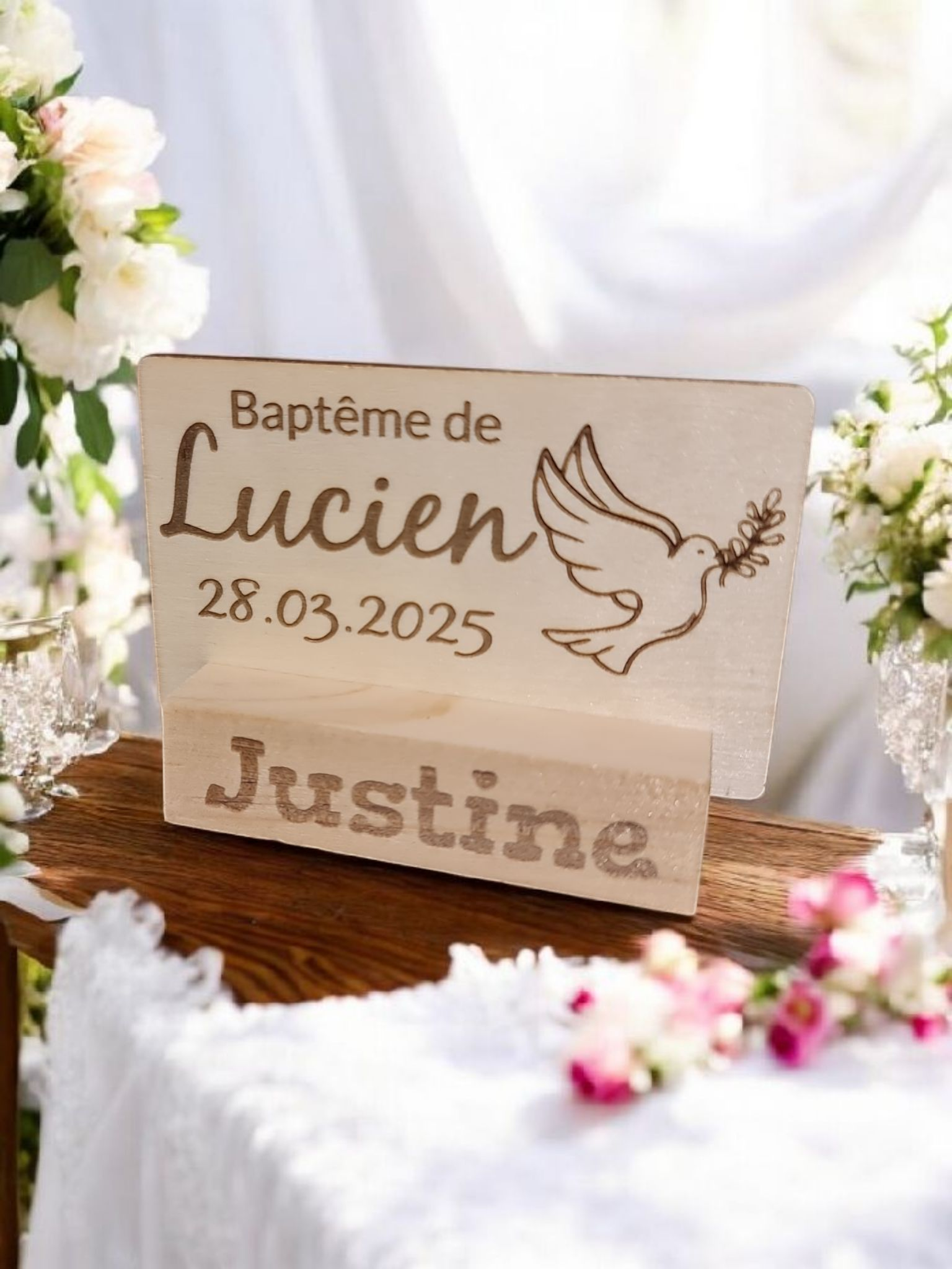 Apportez une touche d’élégance et de personnalisation à votre célébration de baptême avec nos noms de table en bois gravés au laser. Chaque plaque est réalisée avec soin, personnalisée avec le nom de chaque invité ainsi que celui du baptisé, afin de créer un souvenir unique et mémorable pour tous vos invités.