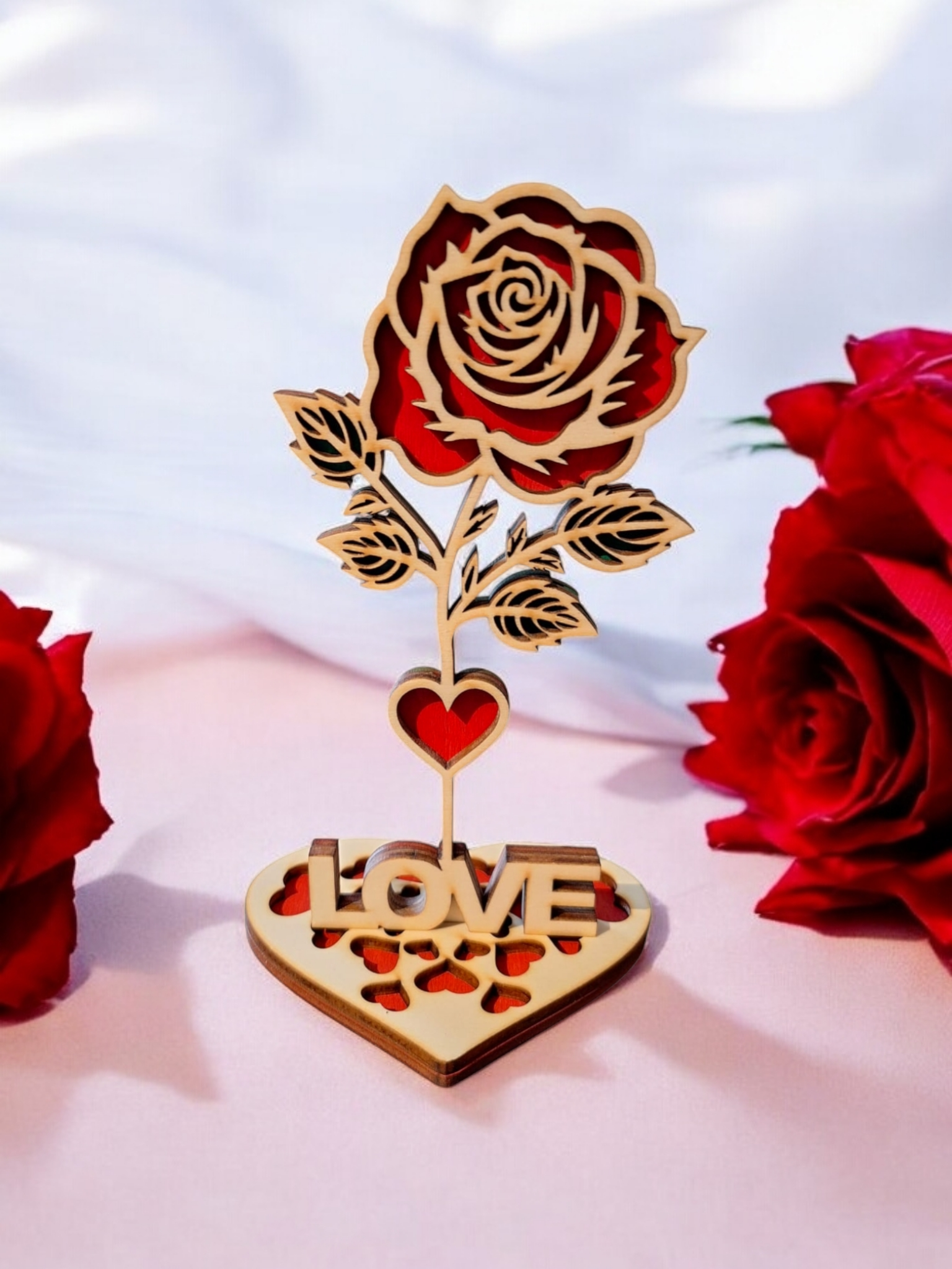 Ajoutez une touche de tendresse et d’élégance à votre intérieur avec cette rose décorative en bois au design raffiné. Conçue comme un symbole d’amour durable, cette rose ne fane jamais : elle apporte une ambiance chaleureuse et romantique au quotidien, tout en restant intemporelle. Sa silhouette délicatement découpée met en valeur les pétales de la rose, les feuilles finement ajourées et un petit cœur au centre de la tige, pour un rendu à la fois doux et décoratif.